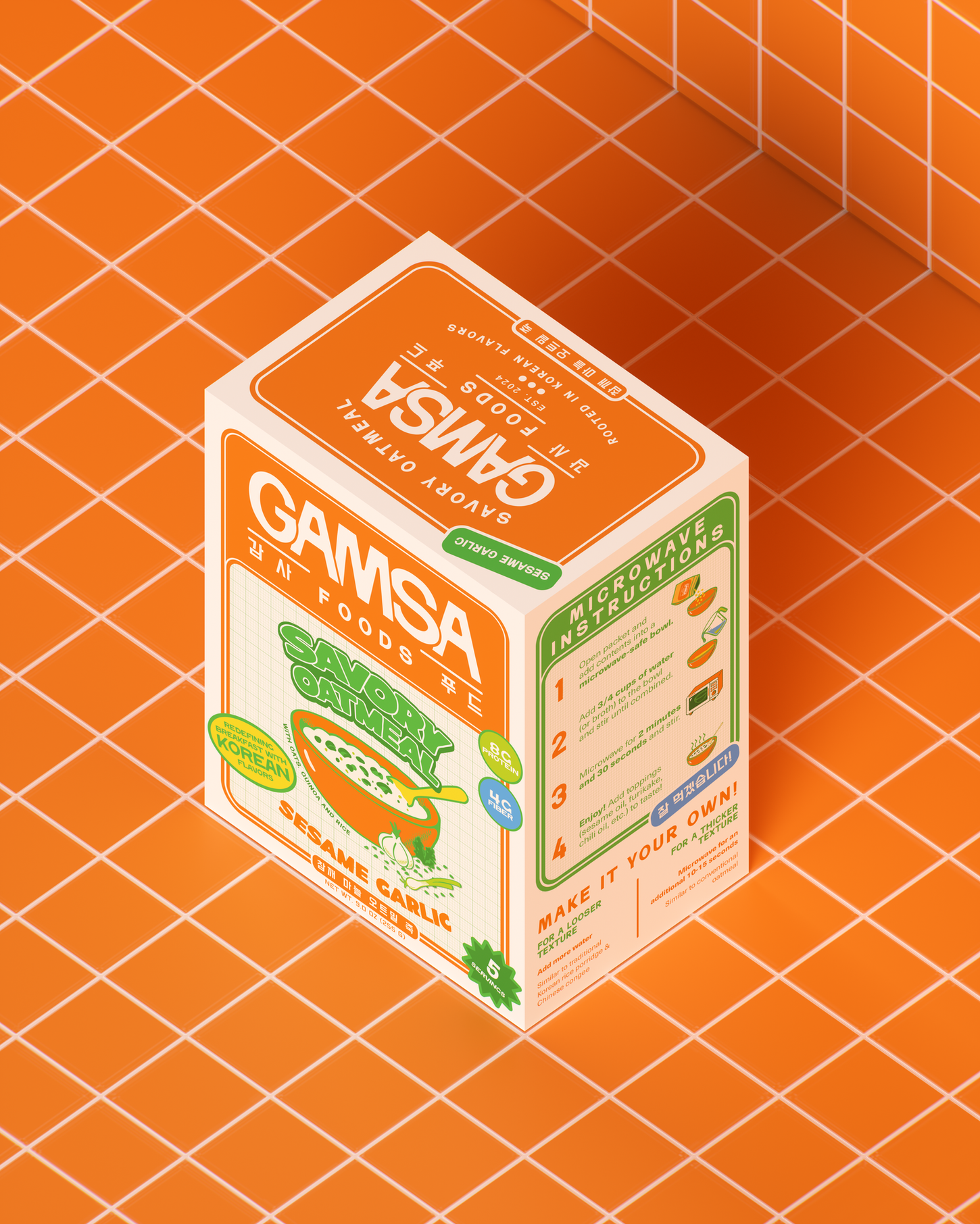 Breakfast, reimagined. Gamsa makes savory oatmeal - the rebel of the cereal aisle. We designed the brand identity and packaging to honor this bold vision: a collision of retro cereal graphics and Korean grocery culture. Using bold colors, custom type, playful illustrations the box behaves like a tiny billboard in the pantry- graphic, loud, and hard to ignore. Proof that breakfast can be more than toast.